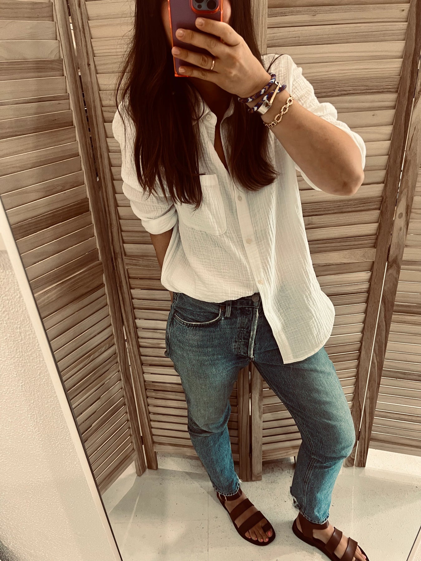 A little more of an elevated feel with the pocket and button detail. The perfect sleeve length to wear as is or roll up you choose your style!