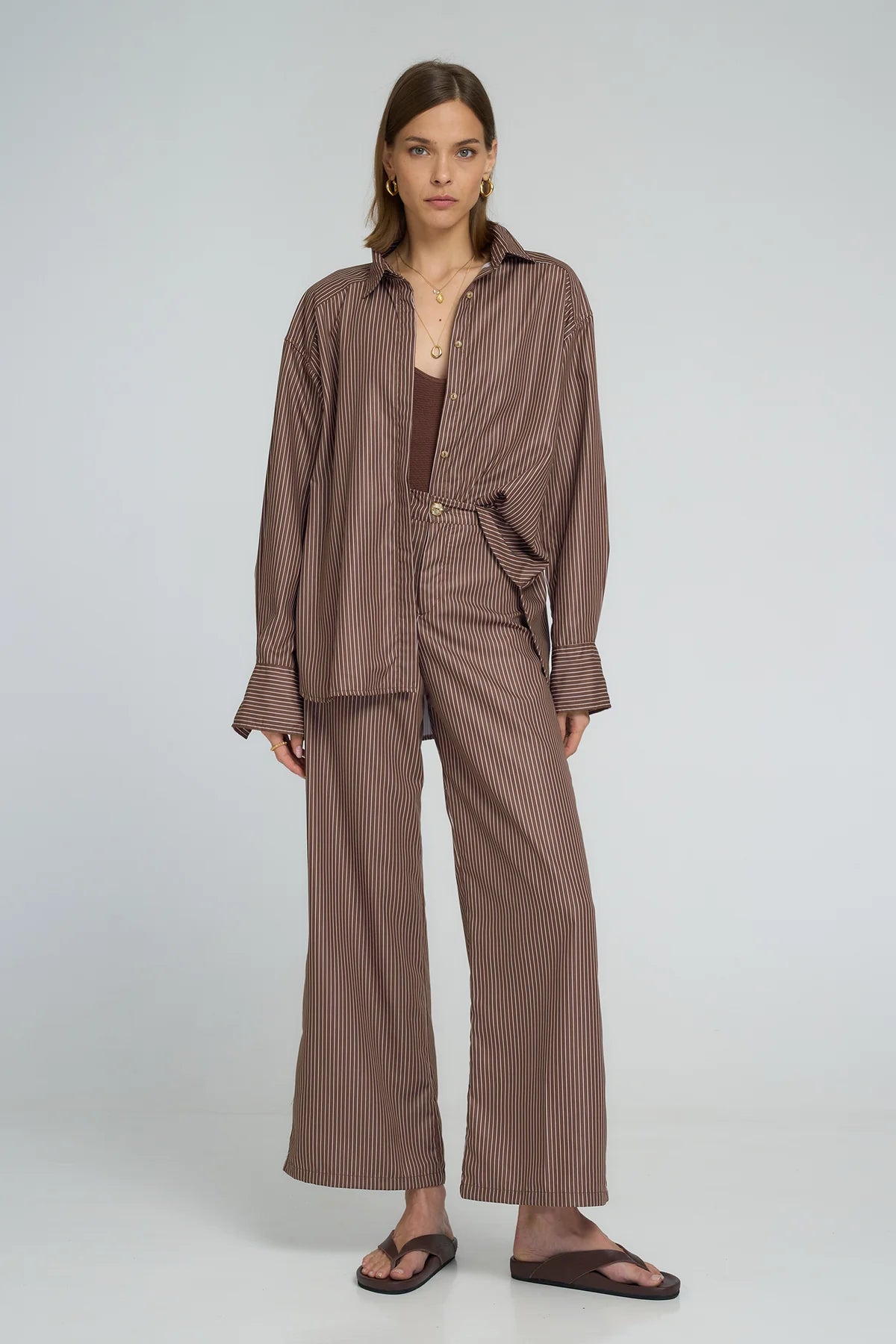 Regular price $179.00A fresh take on a classic, the Hastings Shirt by LILYA is crafted from 100% breathable cotton in a chic cocoa and ivory pinstripe. This oversized blouse features contrasting stripe panels, wide cuffs, and a flattering scooped hemline. Lightweight and versatile, it’s perfect for layering or styling solo.