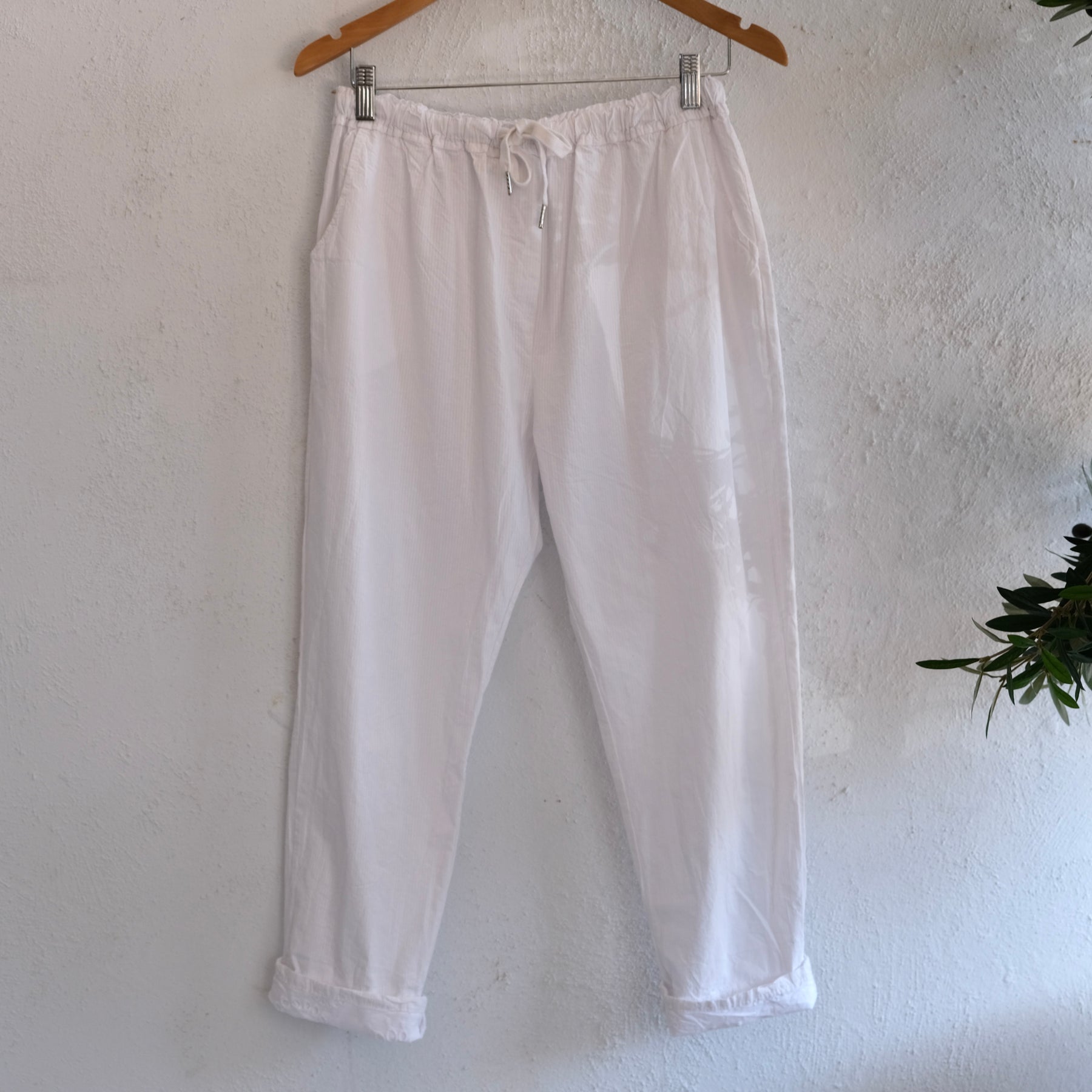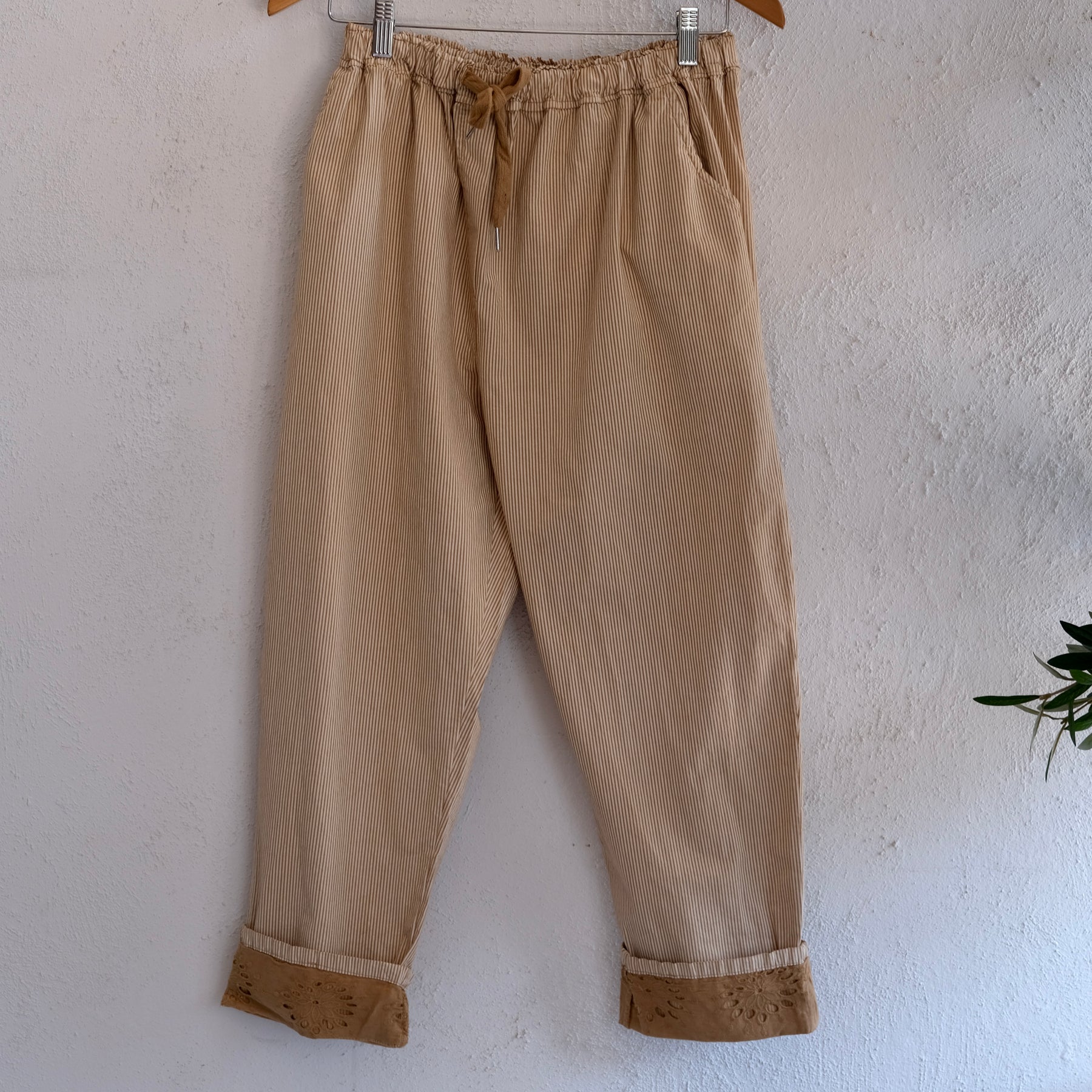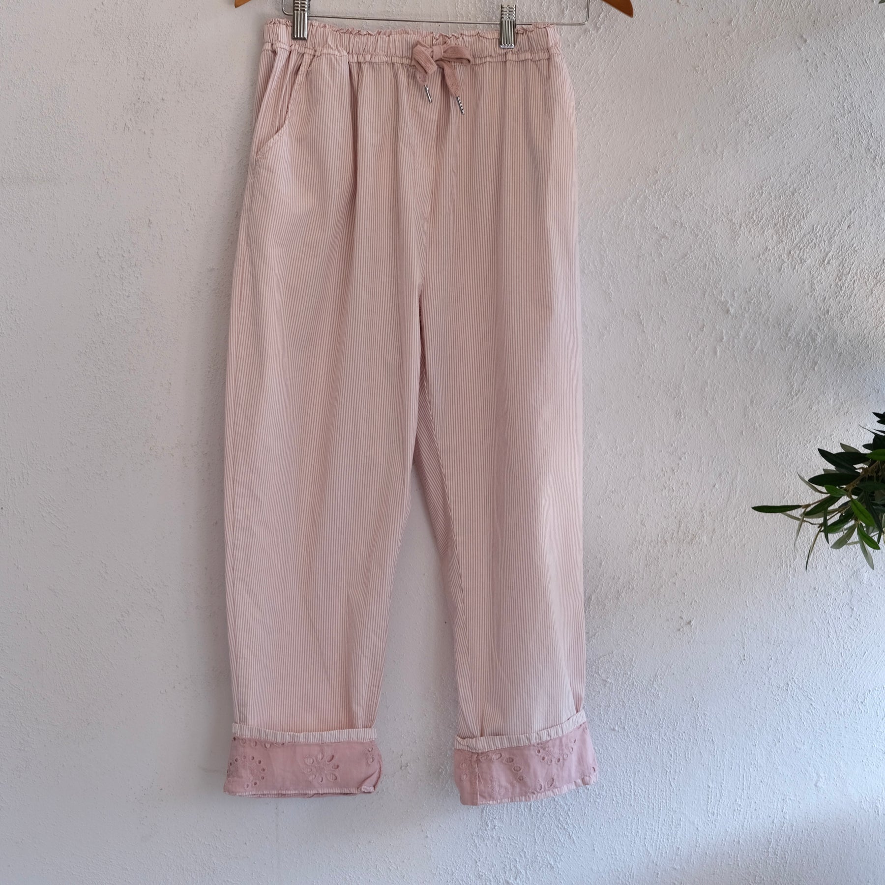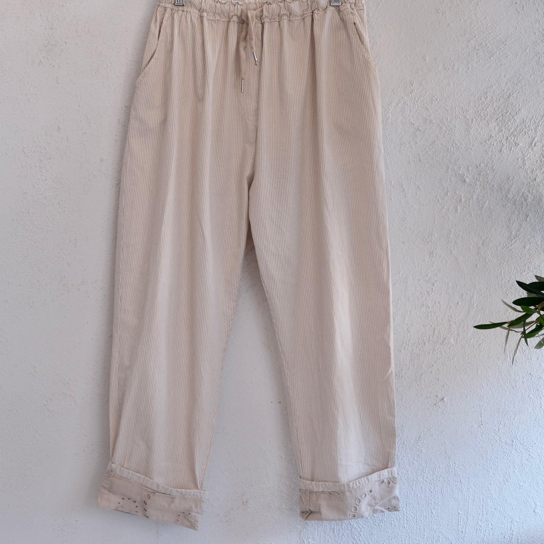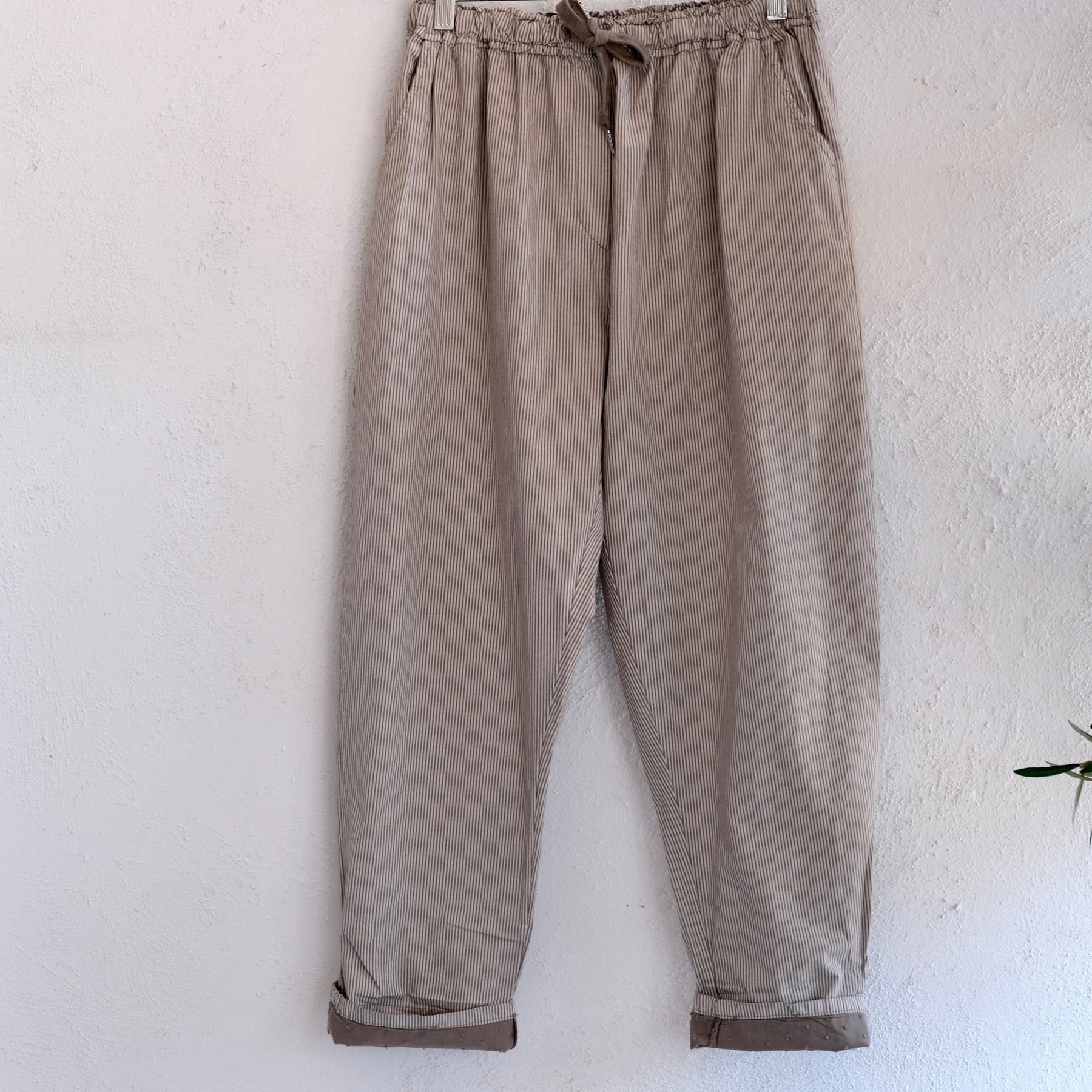 Easy casual cotton pants with thin stripes print, ideal and comfortable for summer, it has two sides pockets and elastic waist with adjustable tie